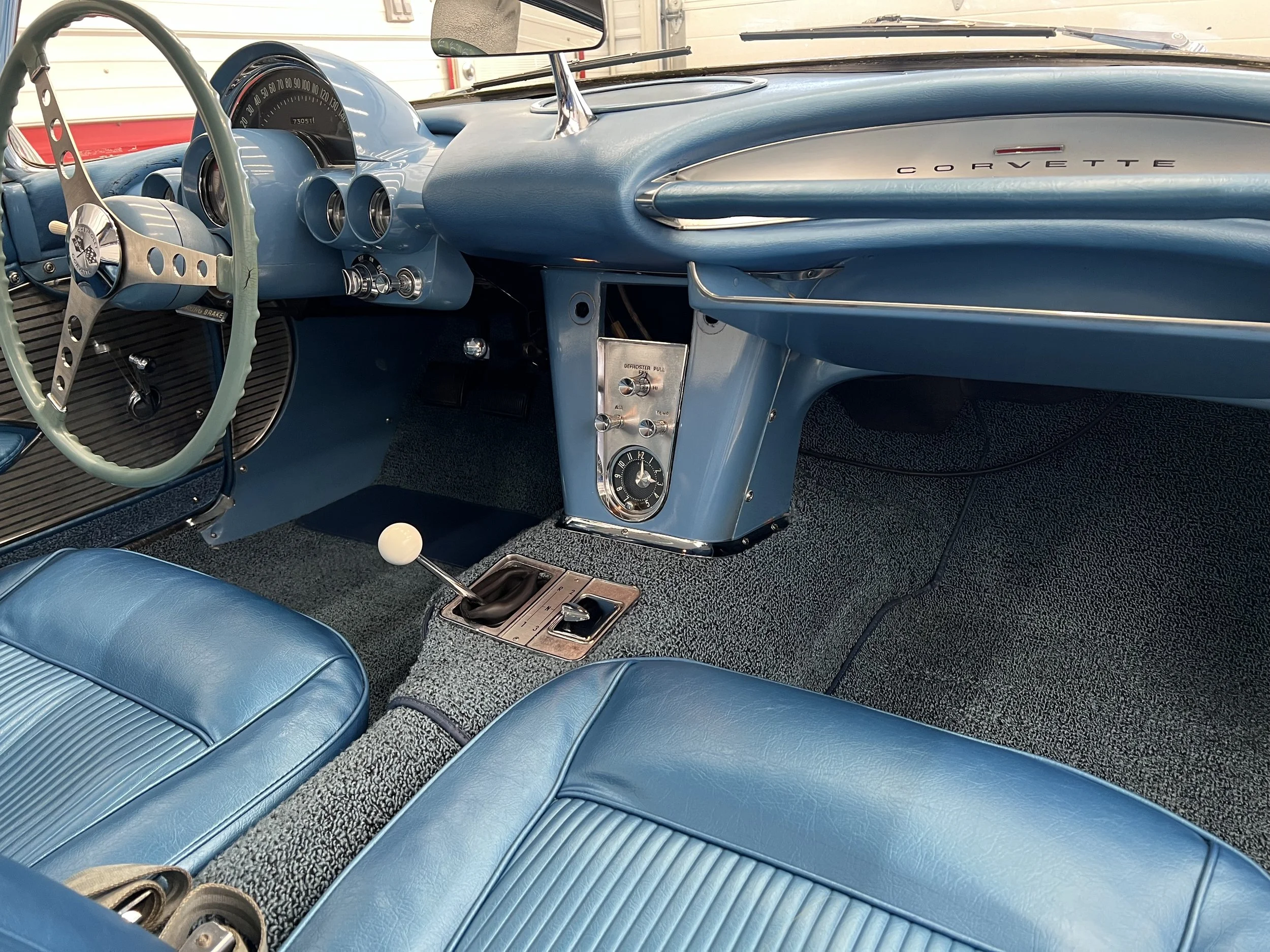 Interior of a classic blue Chevrolet Corvette, showing the dashboard, steering wheel, gear shifter, and front seats in a vintage style.